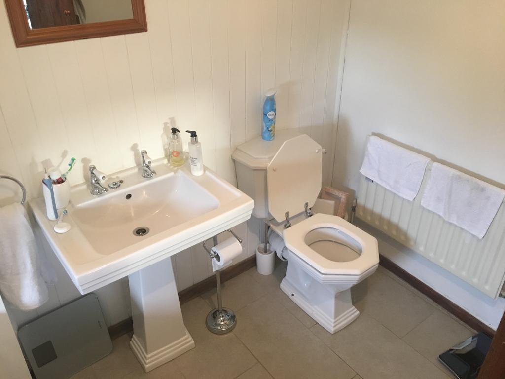 Featuring a wet-room shower, Burlington free standing basin unit, Carrara marble effect porcelain tiles and a Victoria bathroom suite.