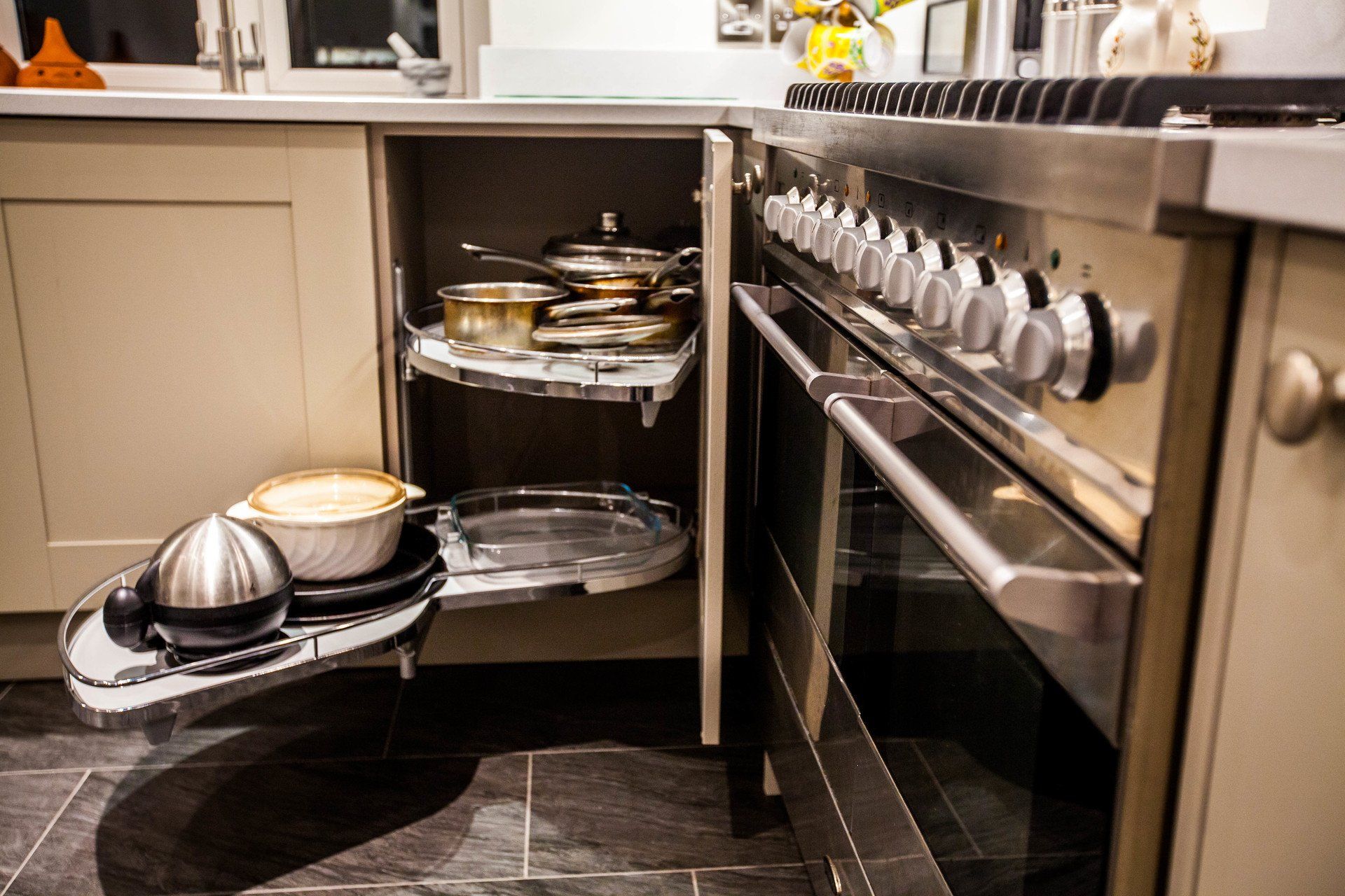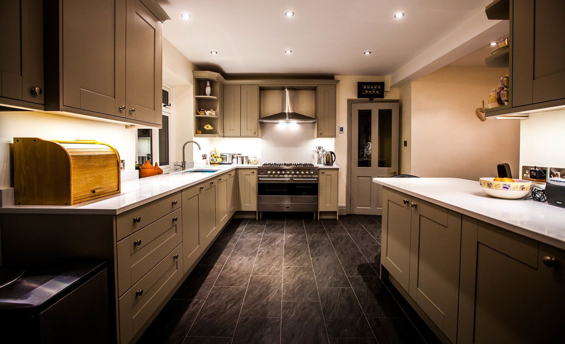 Featuring solid oak doors finished in stone colour, brilliant white quartz worktops with undermount sink and a recessed drainer.